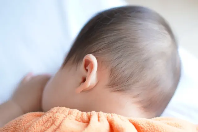 同じ方向ばかりを向いて寝る向き癖がある赤ちゃんに多く見られます。変形が進行すると、平らになった側のおでこが前方に突き出したり、耳の位置が左右でずれて見えたりすることもあります。さらに重度になると、平らになった側の頬骨が前方に出っ張ることもあるため、早めの対処が重要です。