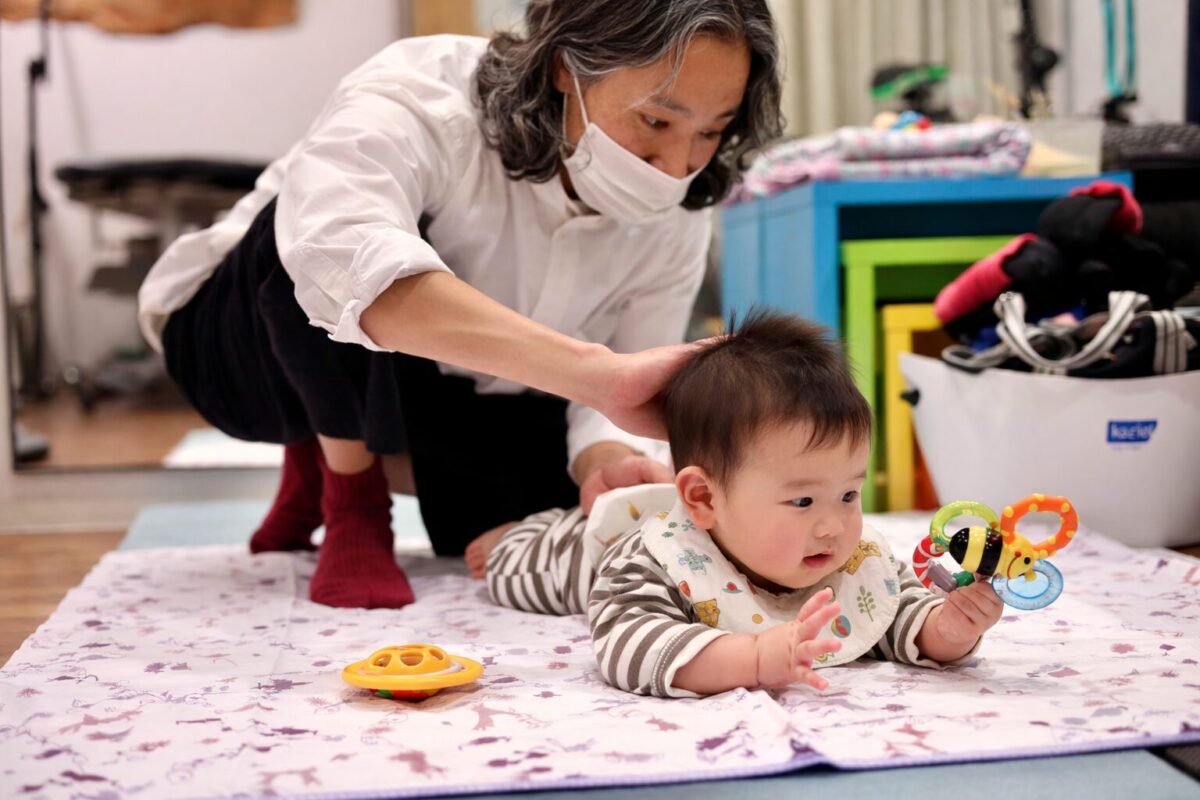 施術においても赤ちゃんがリラックスし且つ運動性を向上できるポイントをしっかりと調整し股関節や首の可動を促した。