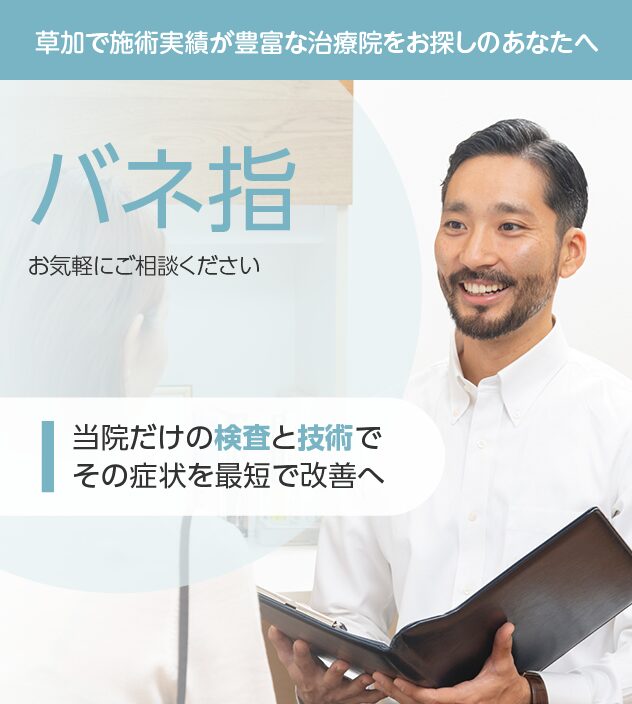 まずは検査によってあなたのバネ指の原因を明らかにします。原因を取り違えてしまえば一時的に良くなったとしても、根本から改善することはないからです。
